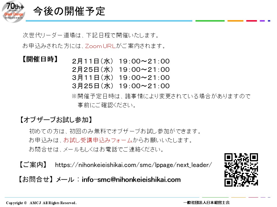 次世代リーダー道場 2023年7月16日 最終更新日時 : 2026年1月14日 サスティナブルマネージメントセンター日本経営士会 SMC 「次世代リーダー道場」 お試し受講申込みフォーム お申し込みはこちらGoogl Form お試し受講申込みフォーム お申し込みはこちらGoogl Form お試し受講申込みフォーム お申し込みはこちらGoogl Form